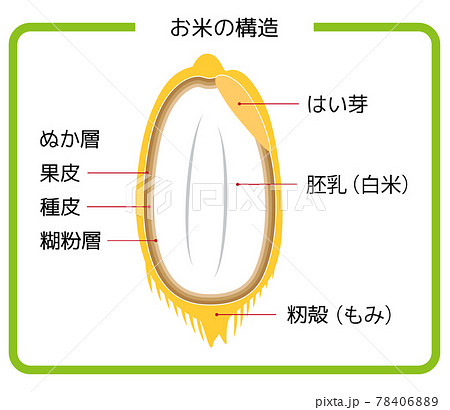日本語版 お米の構造図 もみ殻 玄米 胚芽米 白米 ぬか層 断面図 イラスト ベクター