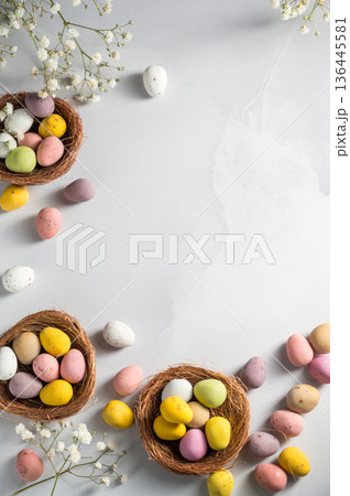 Easter holiday festive background, mini eggs, chocolate candy in nests over bright background