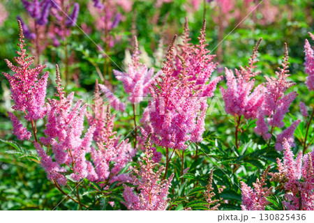Light pink Astilbe with fluffy flower spikes above dark green leaves, creating elegant color and texture for shaded borders and moist garden areas.