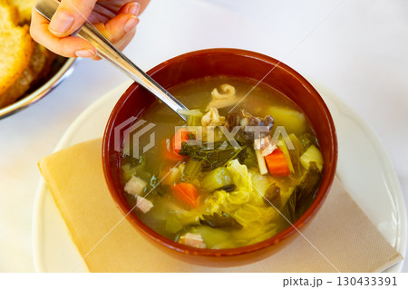 Womans hand takes hearty escudella barrejada soup out of plate with spoon