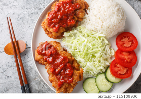 Ayam geprek Crispy Chicken Smashed in Sambal served with white rice, cucumber, tomato and cabbage closeup on the plate. Horizontal top view