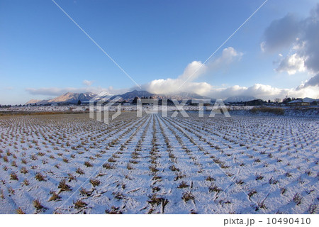 なごり雪が降った田んぼに朝日が射す早朝の南阿蘇から眺める阿蘇五岳