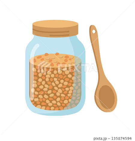 Glass jar with grains and wooden spoon. Zero waste food storage container vector icon