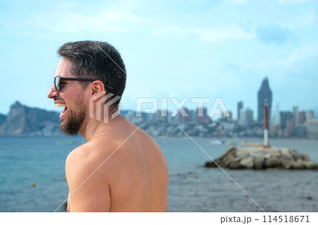 Young Hispanic man model laughing with sunglasses on beach posing sideways