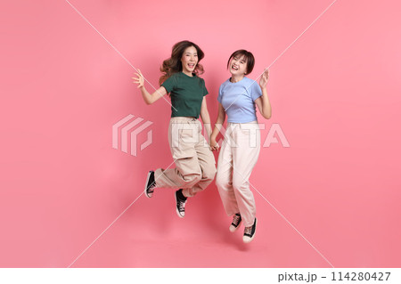 Energetic man and woman jumping joyfully in mid air, celebrating with arms raised high and bright smiles, radiating a sense of freedom, happiness, and playful excitement