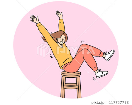 Happy girl is spinning on wooden chair, raising hands up and sharing good mood with others
