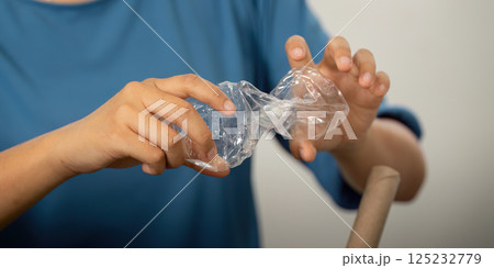 Hands-on Recycling Practices. A child learns how to crush plastic waste to prepare it for recycling, emphasizing eco-friendly habits.
