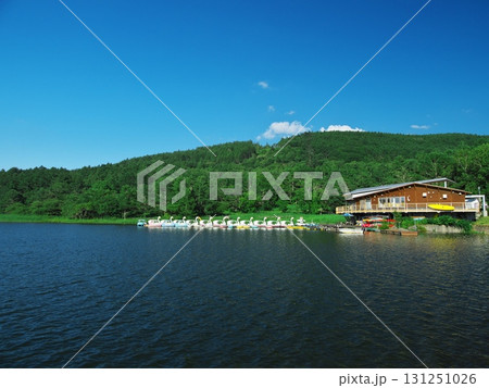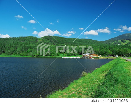 夏の梓湖から奈川渡ダムのアーチと下流を望む