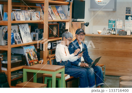 シニア夫婦がカフェでパソコンとスマホを使って調べものをするシーン