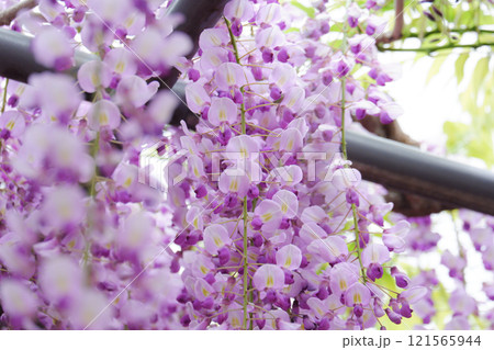 ピンクの藤の花が咲き誇る美しい藤棚のアップ写真