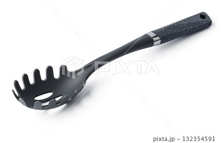 Black plastic spoon for draining on white background