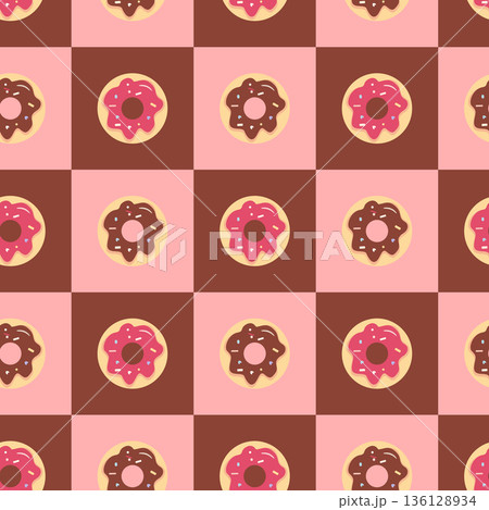 Seamless checkered pattern with chocolate and red donuts