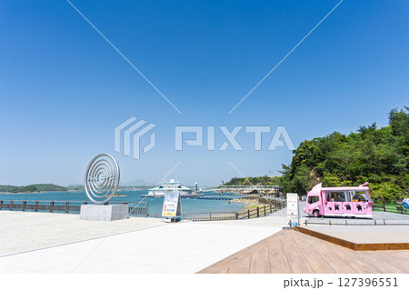 青空を背景に映える広場風景「天草パールガーデン& 海中水族館シードーナツ」