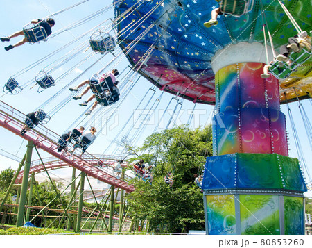 お客さんが楽しんでいる遊園地の回転ブランコ