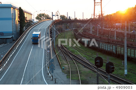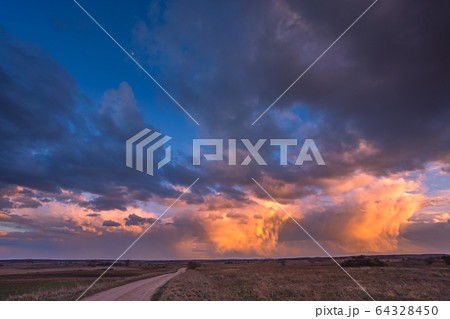 Path to cumulonimbus red storm clouds at sunset, beautiful landscape