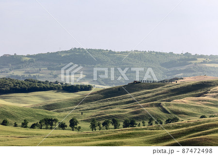 Whimsical silhouette of Tuscany hills covered with greenery in midday summer heat