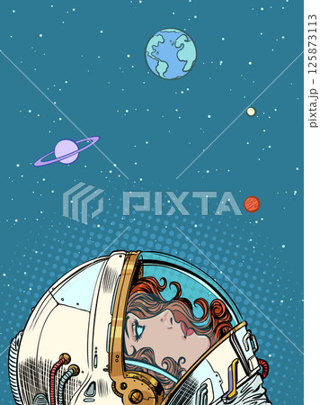 Pop Art Retro Woman astronaut looking up. Study of the universe and space. Cosmonautics Day.