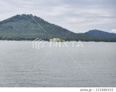 Breathtaking Scenic Lake View Surrounded by Majestic Mountains and a Serene Island