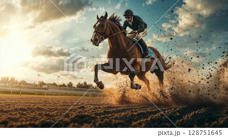 Dynamic shot of horse racing action with jockey and thoroughbred at full gallop, kicking up dirt on racetrack. Dramatic sunset and grandstand create perfect sports photography moment
