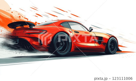 Dynamic red sports car executing a sharp drift on a racetrack surrounded by splashes of paint and motion effects