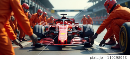 A Formula 1 pit crew is shown quickly changing tires and working on a race car during a high-speed pit stop. The scene captures the intensity and teamwork involved in motorsport.