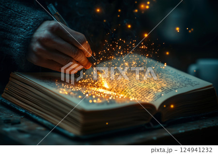 古書に魔法のような光で文字を書く幻想的な手元のシーン