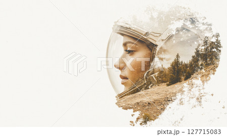 Double exposure female astronaut in helmet merging with landscape, futuristic concept