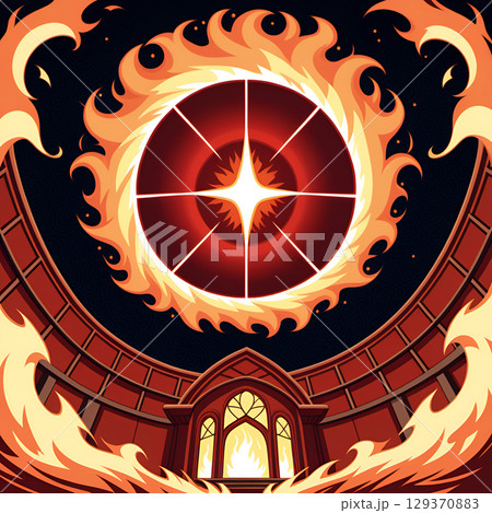 Fiery portal above ancient structure with glowing center and surrounding flames