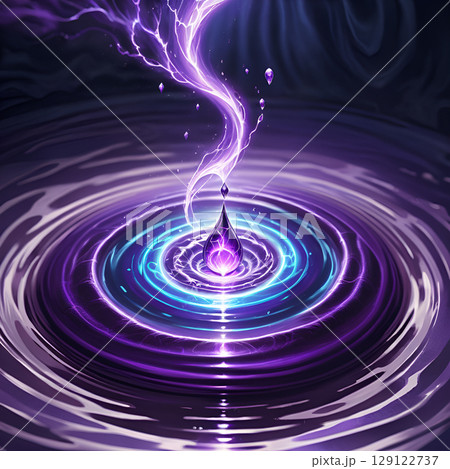 Mesmerizing purple energy surge creating ripples and glowing crystal drop in dark abyss