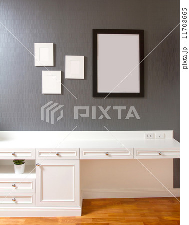 Empty white square frame hanging on a dark wooden wall illuminated by two spotlights in a modern apartment or art gallery with concrete and glass elements, perfect for showcasing artwork or design