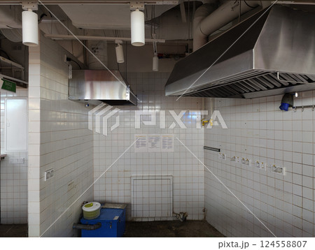 Industrial-style commercial kitchen space with tiled walls, stainless steel ventilation hoods, and visible piping. The room appears empty, showing utility and infrastructure.