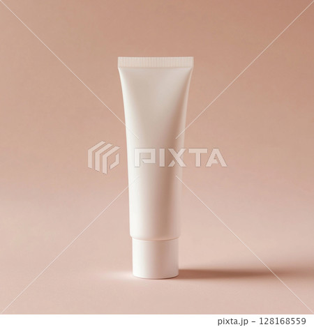 An unlabeled cosmetic tube decorated with starfish and shells on a white sand background. Beach scene for cosmetics advertisement with sunlight.