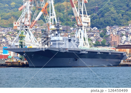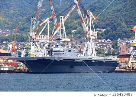 【広島県】晴天の海上自衛隊 呉基地に停泊する大型護衛艦 かが