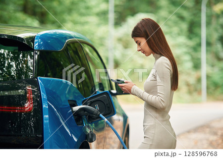 Leaning, using smartphone. Young woman is standing outdoors near electric automobile that is charging