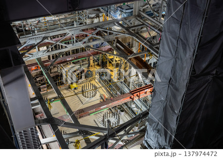 RC造の解体 鉄骨の躯体を取り壊す重機