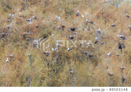 北海道美唄市、東明公園脇の森に形成されたアオサギのコロニー【4月】