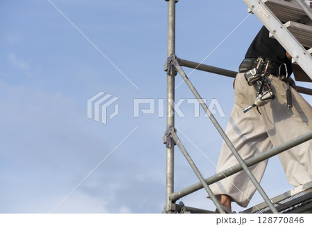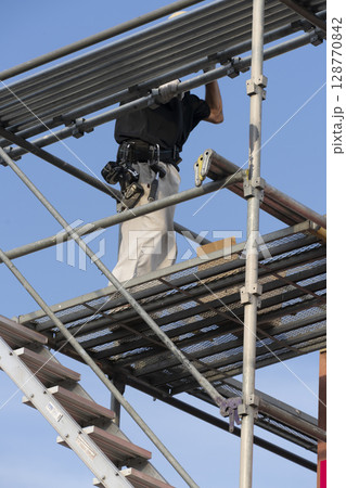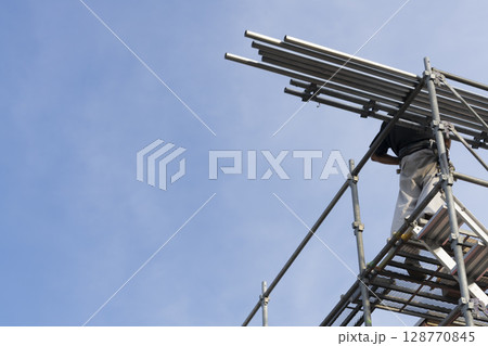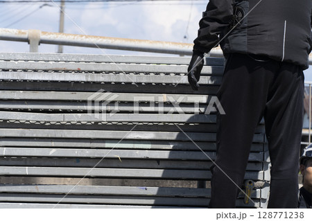 足場の組み立て 資材をトラックから降ろして準備する職人