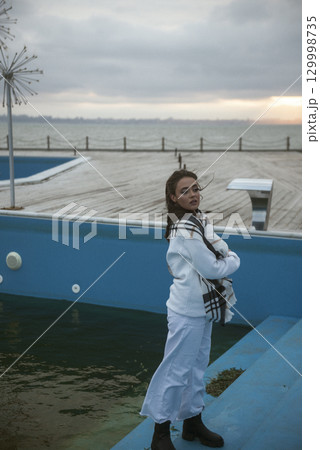 Beautiful young girl in white tracksuit stands near big empty swimming pool