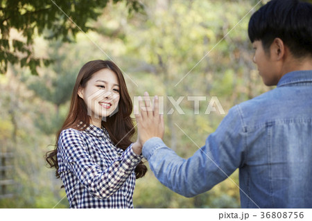 公園 夕焼け 東洋人