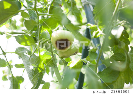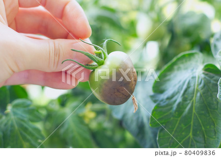 The hands of a white man hold a close-up of unripe tomato fruits in the garden, damaged by a lack of necessary trace elements and organic fertilizers. The tips of the brush are slightly dry
