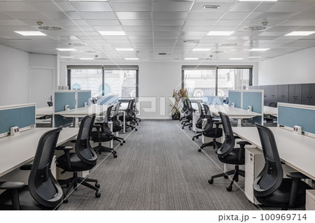 Soothing gray office with long tables and chairs before the opening of a driving school in anticipation of students. Concept of school and advanced training center
