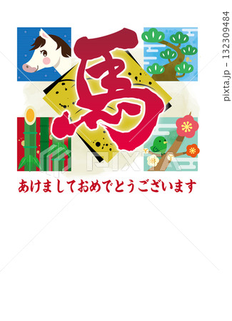 馬の字の習字と馬さんと松竹梅の4つ窓の年賀状イラスト(和風・干支・縁起物デザイン)