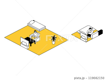 広い家に住んでいる男性と狭い家に住んでいる男性のイラストセット
