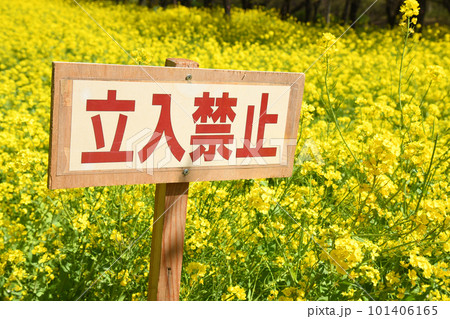 菜の花の中にある立入禁止の看板