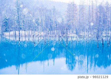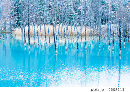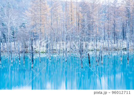 北海道の冬の訪れ うっすらと雪が積もった美瑛町の青い池