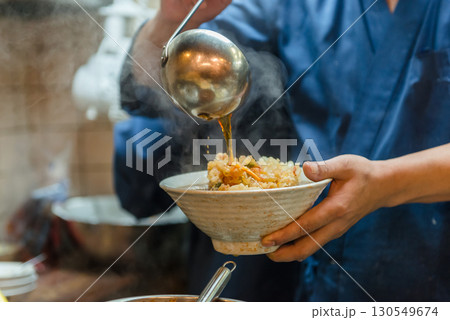 かき揚げそばに出汁つゆを注ぐ料理人、立ち食いそば屋