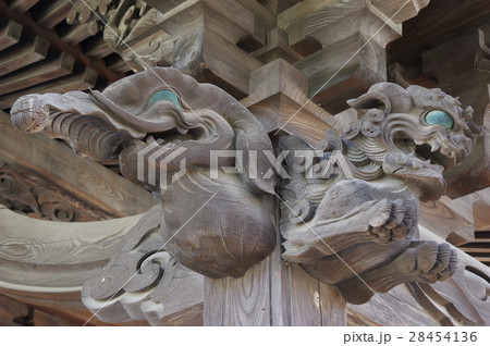 信州 上伊那 箕輪町の長岡神社 拝殿木鼻彫刻 1801年建造の本殿は諏訪立川流初代 立川富棟の作品