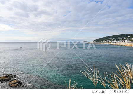 神奈川県横須賀市、夕暮れの秋谷の立石で水平線と富士山が見える海岸