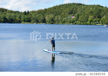 女神湖でSUPを楽しむ人