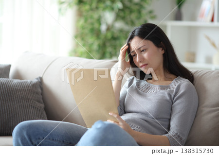 A young woman looks upset as she reads a document that she has just pulled from a brown envelope while at home on the couch.